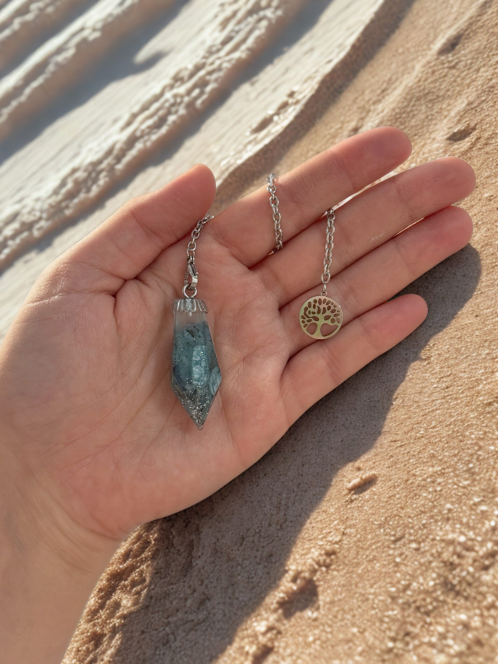 Description du produit : Pendule en forme de long losange, d’un bleu profond aux reflets vibrants, symbolisant la sagesse et l’harmonie avec de fines paillettes argentées.